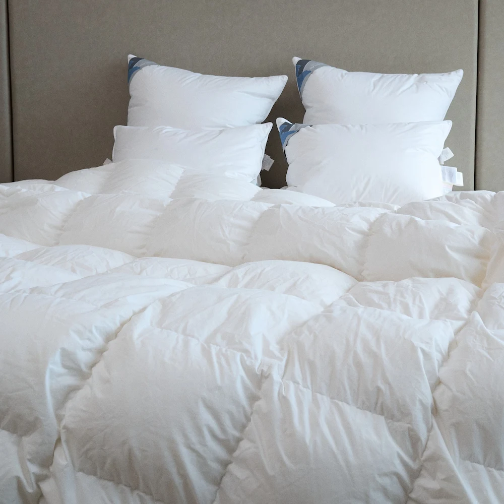 - Wrapped in a tightly woven cotton batiste fabric to avoid spreading of down.